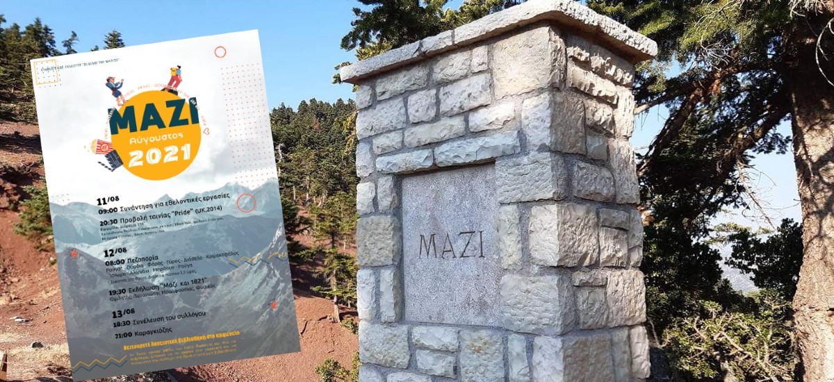 Στις Νότιες πλαγιές του Χελμού σε μια ιδιαίτερα οχυρή θέση, πνιγμένο μέσα στα νερά και τα έλατα βρίσκεται το θρυλικό χωριό Μάζι, με το μεγαλύτερο υψόμετρο (1200m) από όλα τα χωριά του Δήμου Καλαβρύτων.Σ’ αυτό το εξαιρετικό περιβάλλον από τις 11 έως 13 Αυγούστου από το δραστήριο Εξωραϊστικό Σύλλογό του, « Οι Φίλοι του Μαζιού» θα πραγματοποιηθούν Εκδηλώσεις Φυσιολατρικές ( Πεζοπορία) και Πολιτιστικές (Προβολή Ταινίας – παράσταση Καραγκιόζη) καθώς και Λειτουργία Δανειστικής Βιβλιοθήκης. Επιπλέον με την ευκαιρία των 200 χρόνων από την Ελληνική Επανάσταση, διοργανώνεται την Πέμπτη 12 Αυγούστου, Εκδήλωση – Αφιέρωμα στο…