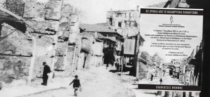 ΤΡΙΣΑΓΙΟ ΣΤΗ ΜΝΗΜΗ ΤΩΝ ΜΑΡΤΥΡΩΝ ΤΟΥ ΚΑΛΑΒΡΥΤΙΝΟΥ ΟΛΟΚΑΥΤΩΜΑΤΟΣ ΝΕΟΣ ΚΟΣΜΟΣ, 7 ΔΕΚΕΜΒΡΙΟΥ 2025, 11:30 Π.Μ. 82 χρόνια από το Καλαβρυτινό Ολοκαύτωμα! 82 χρόνια από τη διάπραξη ενός από τα πιο ειδεχθή και στυγερά εγκλήματα πολέμου σε βάρος του άμαχου πληθυσμού στην Ελλάδα κατά τη διάρκεια του Δευτέρου Παγκοσμίου Πολέμου. Η Ένωση Καλαβρυτινών Αθήνας, συμμετέχοντας στις Εκδηλώσεις Μνήμης του Δήμου της Μαρτυρικής Πόλης των Καλαβρύτων, τελεί την Κυριακή, 7 Δεκεμβρίου 2025, στις 11:30 π.μ. το καθιερωμένο ετήσιο Τρισάγιο για την ανάπαυση των ψυχών των εκτελεσθέντων Καλαβρυτινών από τα γερμανικά στρατεύματα κατοχής…