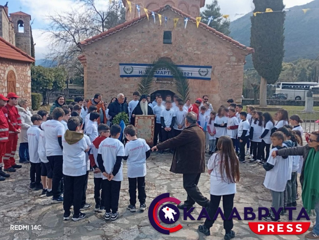Οι μαθητές παρέλαβαν αντίγραφο του Ιερού Λαβάρου από τον καθηγούμενο της Μονής, πατέρα Ευσέβιο «Ελευθερίας Πορεία» για την Ιστορική διαδρομή του Παλαιών Πατρών Γερμανού στην Πάτρα. Η εκκίνηση «Ελευθερίας Πορεία» δόθηκε σήμερα από τον προαύλιο χώρο της Ιστορικής Μονής Αγία Λαύρα, με τους μαθητές του Δήμου Καλαβρύτων του Δήμου Ερυμάνθου και Δήμου Πατρέων να ακολουθούν
