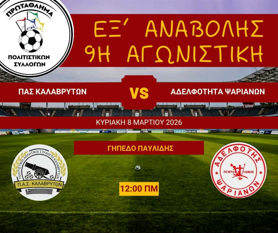 ΠΟΔΟΣΦΑΙΡΙΚΟ ΤΟΥΡΝΟΥΑ ΠΟΛΙΤΙΣΤΙΚΩΝ ΣΥΛΛΟΓΩΝ ΚΑΛΑΒΡΥΤΩΝ Αυτή την Κυριακή η ομάδα των χωριών μας αντιμετωπίζει τα Ψαρά στην τελευταία αγωνιστική για το πρωτάθλημα. Μόνο που αυτή τη φορά, στο γήπεδο δεν θα μπουν πρώτοι οι παίκτες. Θα μπουν οι άνθρωποι που τόσα χρόνια βρίσκονται σιωπηλά πίσω από αυτούς. Οι διοργανωτές. Οι συγχωριανοί μας. Εκείνοι που κάθε