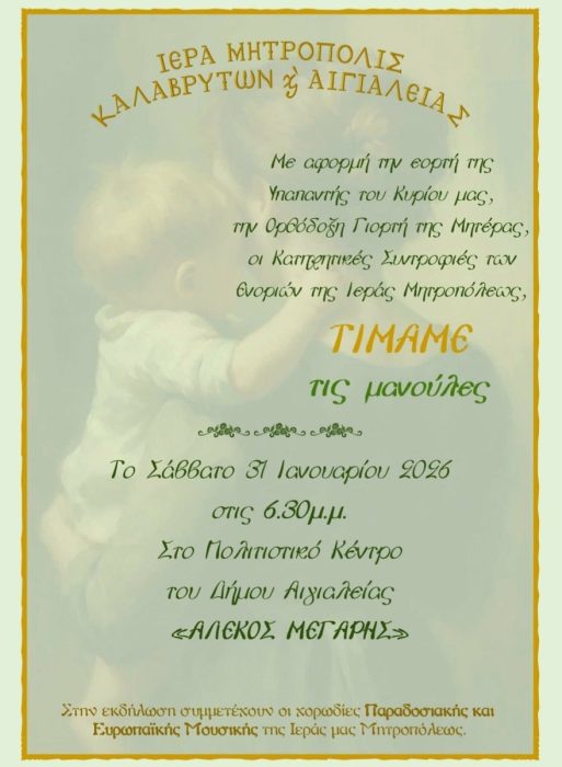 Ως εκ τούτου, η Ιερά Μητρόπολη Καλαβρύτων και Αιγιαλείας θα διοργανώσει ειδική εκδήλωση, με την παρουσίαση ποιημάτων και θεατρικών δρωμένων από τα παιδιά των Κατηχητικών Σχολείων των Ενοριών του Αιγίου, τo Σάββατο 31 Ιανουαρίου 2026 και ώρα 6:30 μ.μ., στο Πολιτιστικό Κέντρο Αιγίου «ΑΛΕΚΟΣ ΜΕΓΑΡΗΣ».