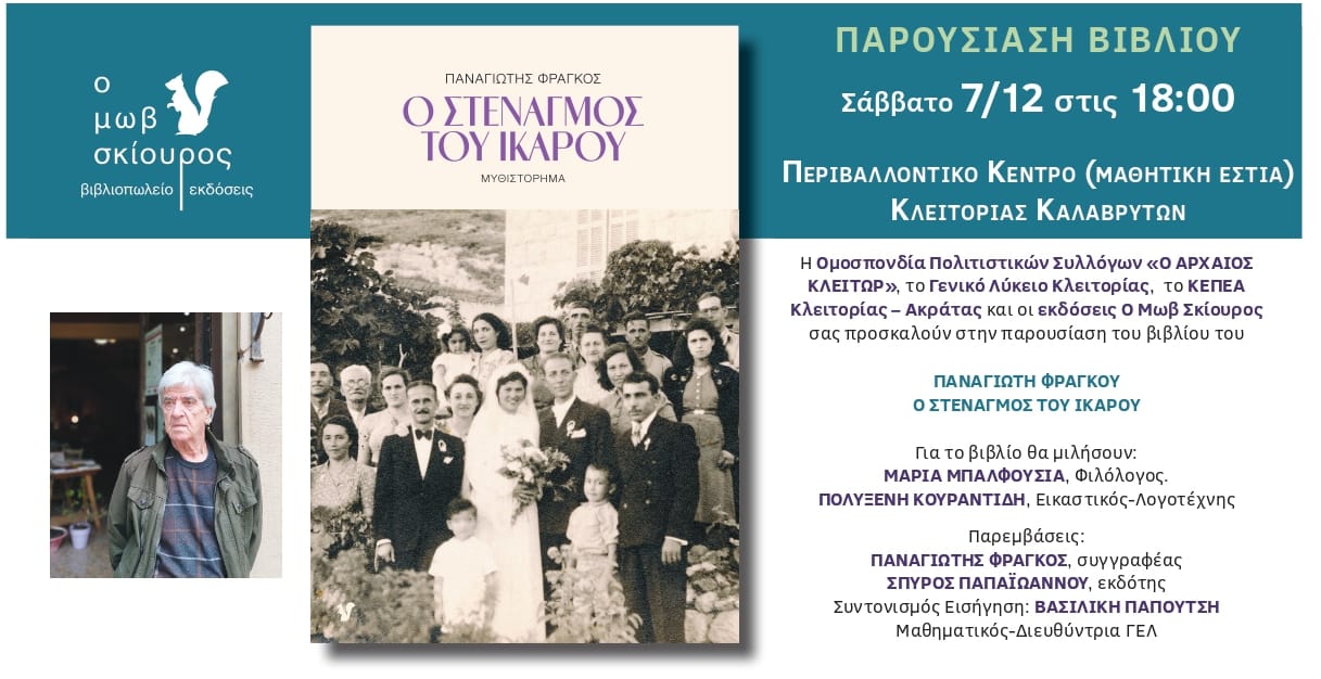 Παρουσίαση του νέου βιβλίου του συγγραφέα Παναγιώτη Φράγκου “Ο Στεναγμός του Ίκαρου” θα γίνει το Σάββατο 7 Δεκεμβρίου 2024 στην αίθουσα εκδηλώσεων στο Περιβαλλοντικό Κέντρο Κλειτορίας (Μαθητική Εστία) στις 18:00 μ.μ.