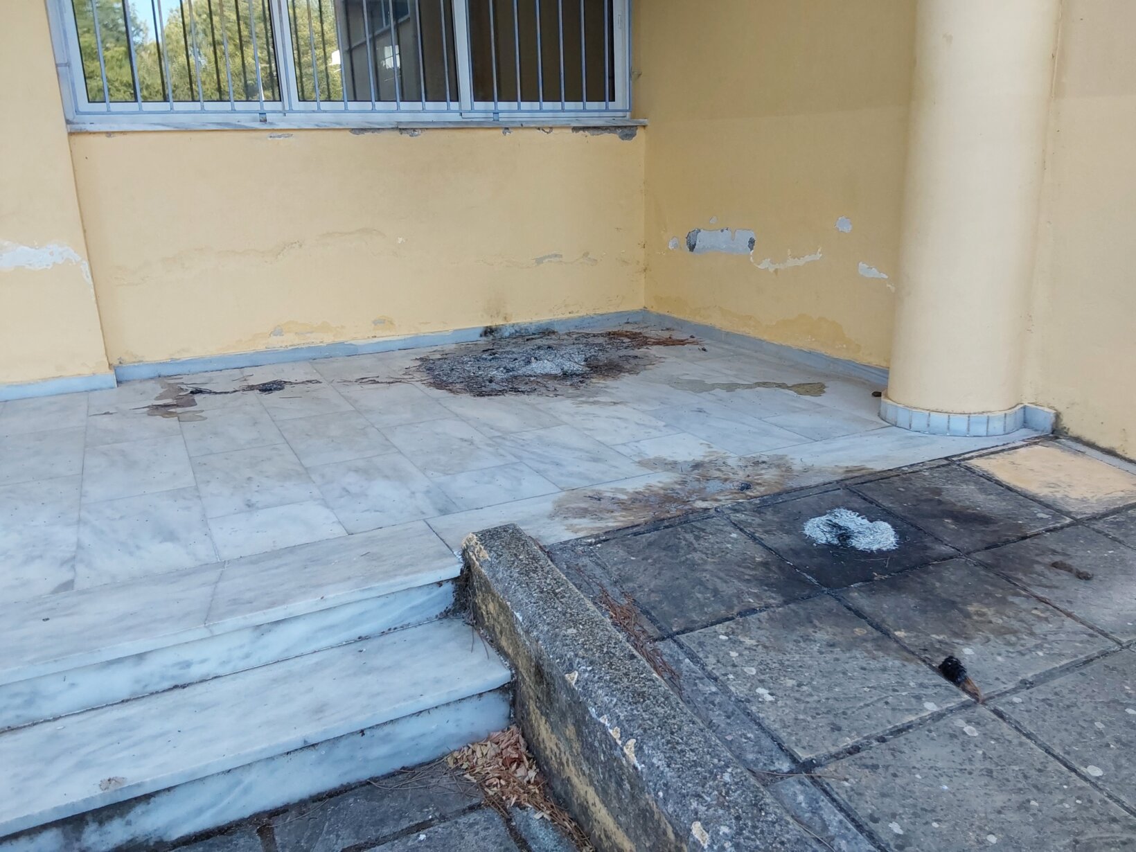 Οι ανεγκέφαλοι νυχτερινοί επισκέπτες, μέσα στην αντιπυρική περίοδο και τη στιγμή που όλη η Έλλάδα μαστίζεται από τις πυρκαγές, δεν δίστασαν να ανάψουν φωτια, στον χώρο του σχολείο, για να κάψουν πευκοβελόνες, πλαστικά και κουκουνάρια από τα πεύκα. Δεν σκέφτηκαν ότι μια σπίθα ή ένα κουκουνάρι που θα σκάσει μπορεί να προκαλέσει μια πυρκαγιά η οποία θα εβαζε σε κίνδυνο ολόκληρο το χωριο, αφού γύρω από το σχολείο υπάρχουν δέντρα και πεύκα και το σχολείο βρίσκεται δίπλα σε σπίτια και στο Κέντρο Υγείας.