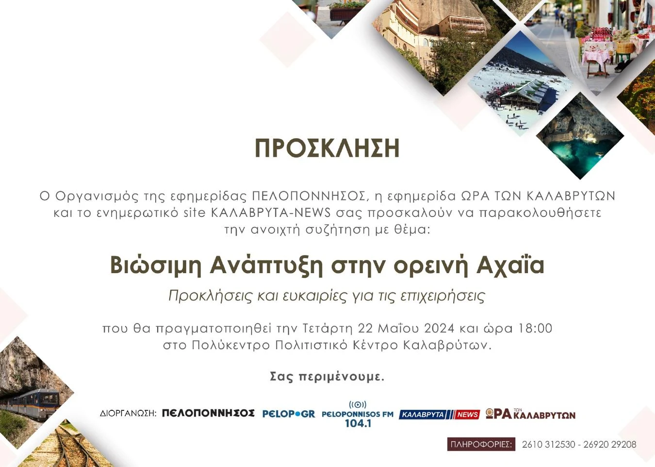 «Βιώσιμη ανάπτυξη στην ορεινή Αχαΐα, προκλήσεις και ευκαιρίες για τις επιχειρήσεις» είναι το θέμα της ανοιχτής συζήτησης που διοργανώνουν από κοινού, την προσεχή Τετάρτη 22 Μάϊου, στο Πολυδύναμο Πολιτιστικό Κέντρο Καλαβρύτων ο Δημοσιογραφικός Οργανισμός της εφημερίδας «Πελοπόννησος», η εφημερίδα «Ώρα Καλαβρύτων» και η ενημερωτική ιστοσελίδα «kalavrytanews.com». Οι εργασίες της ανοιχτής συζήτησης θα ξεκινήσουν στις 6 το απόγευμα. Το δε πρόγραμμα των εργασιών περιλαμβάνει τοποθετήσεις εκπροσώπων αρχών και φορέων της περιοχής ενώ μεταξύ των ομιλητών θα είναι ο Δήμαρχος Καλαβρύτων Θανάσης Παπαδόπουλος, ο εκδότης της εφημερίδας «Πελοπόννησος» Θεόδωρος Λουλούδης, ενώ τον…
