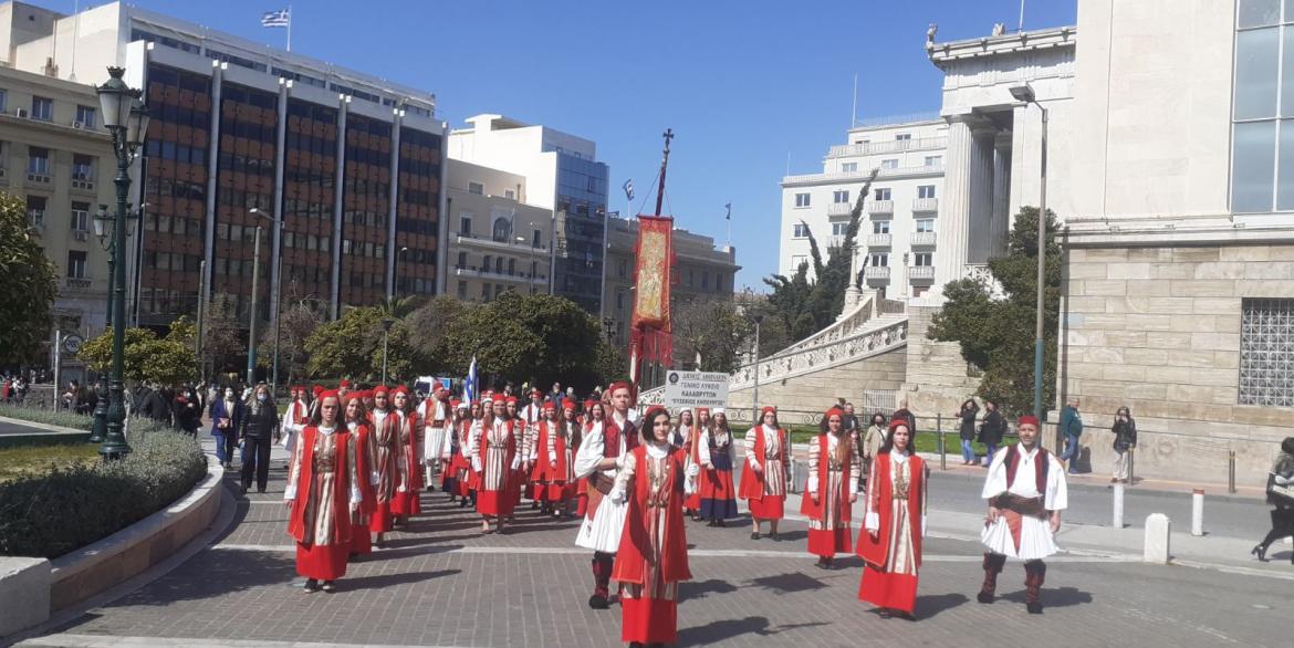 Με παραδοσιακές ενδυμασίες και τον σημαιοφόρο να κρατά αντίγραφο του Λαβάρου που ύψωσε στην Ιερά και Ιστορική Μονή της Αγίας Λαύρας ο Παλαιών Πατρών Γερμανός, οι μαθητές των Καλαβρύτων παρήλασαν στο κέντρο της πρωτεύουσας και χειροκροτήθηκαν απ’ τους πολίτες που είχαν συγκεντρωθεί.